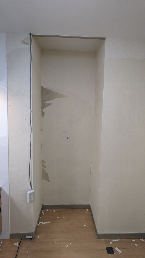 次回クロス貼替する際に手間がかかるため、塩ビモールの間隔を詰めます。